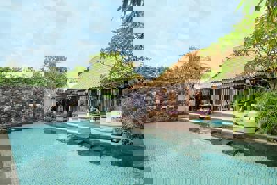 Bamboo Pool Villa with Daily Afternoon Tea (140 m²) Sfeervol ingericht met Indonesische kunst en voorzien van een privézwembad, aparte woonruimte en uitzicht via glazen deuren. Geschikt voor drie personen.
