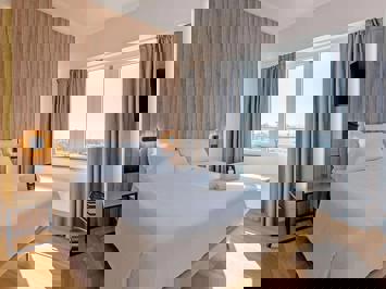 Appartement met 1 Slaapkamer en Uitzicht op de Stad: Een zelfstandig appartement met woonkamer, aparte slaapkamer, kitchenette en uitzicht over de stad.