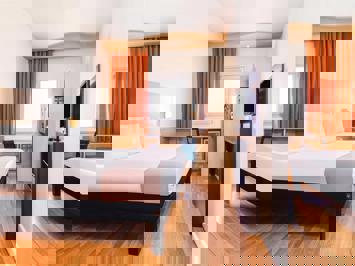 Standaard Kamer met 2 Bedden (17 m²): Net als de tweepersoonsvariant is ook deze kamer modern ingericht, maar uitgerust met twee eenpersoonsbedden. Ideaal voor wie samen reist en apart wil slapen.